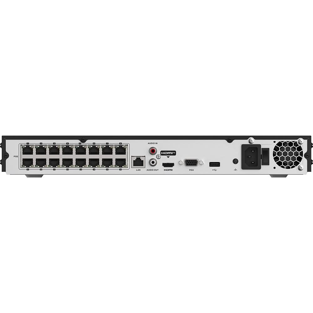 ASE NVR616 16 Channel Digital Network Video Recorder with 16x PoE. It provides an advanced solution for video surveillance, with up to 16 IP camera inputs supporting various video formats, including H.265+/H.265/H.264+/H.264. With a maximum input bandwidth of 160Mbps, it ensures clear image recording. H.265+ compression greatly reduces storage space requirements by up to 75%, allowing for efficient resource management. Simultaneous HDMI and VGA video outputs provide viewing flexibility, with support for up to 4K resolution via HDMI for detailed, sharp images. For storage, there are two SATA interfaces for connecting HDD drives up to 8TB each, while intelligent search and playback improve efficiency in analyzing recorded videos.